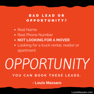 But what about the leads that have the correct name and phone number but aren’t looking for a mover? When you call them they say, “I was just looking for an apartment” or “I just wanted to rent the truck, and do it myself” or “I was just looking for a realtor”. What do you do with those leads? Treat them as opportunities.